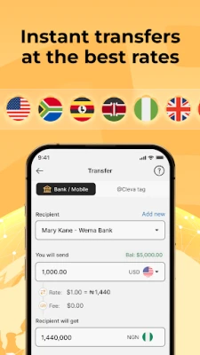 Aika kuɗi cikin hanzari ga dangi da abokai a Najeriya, Ghana, Uganda, da sauran ƙasashen Afirka kai tsaye zuwa bankunansu ko asusun wayar hannu. Idan kai mai zaman kansa ne, ma'aikacin nesa, ko mai haɓaka abun ciki, Cleva yana sauƙaƙa karɓar biyan kuɗin USD daga ma'aikata ko abokan ciniki. Haka kuma, zaka iya karɓar stablecoins kamar USDT ko USDC cikin walat ɗinka na Cleva a cikin mintuna kaɗan, kuma canja wuri ga abokai a kan Cleva kyauta ne.