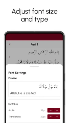 Kwarewar karatu ta zama ta musamman tare da ikon daidaita rubutu: zaku iya zaɓar nau'in rubutun Larabci da kuke so, da kuma canza girman rubutun don dacewa da gani, har ma da zaɓin yin rubutun ya zama mai kauri don ingantacciyar karantawa. Don ƙara zurfafa fahimta da jin daɗi, Dalailal Khayrat yana bayar da karatun murya daga mashahuran makaranta irin su Abdul Hakim Khizrane da Ishak Danis, wanda zai iya gudana a bango yayin da kuke yin wasu ayyuka. Kuma don karatu a cikin dare ko a yanayin da ba shi da haske, akwai yanayin duhu (dark mode) wanda aka tsara don rage gajiyar ido da samar da kwanciyar hankali.