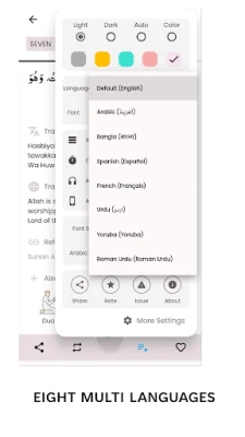 Don zurfafa fahimtarka da kuma sauƙaƙa karatu, wannan manhaja ta zo tare da karatun sauti mai daɗi, haruffa na yaren Larabci (transliteration), da fassarori a cikin manyan harsuna bakwai (7). Haka kuma, tana da nassoshi na Hadisai don tabbatar da inganci, da kuma shawarwari masu amfani a inda ake buƙata. Don daidaita kwarewarka, za ka iya zaɓar daga nau'ikan rubutun Larabci guda shida (6) daban-daban, har ma da rubutun Nurani na musamman. Akwai kuma zaɓin nuna addu'o'in a cikin Larabci kaɗai ga waɗanda suka fi son hakan.