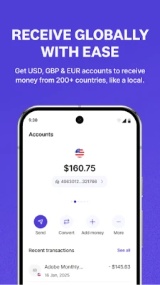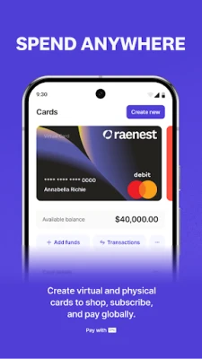 Buɗe asusun ajiyar kuɗi na duniya (USD, GBP, EUR) a cikin mintuna kaɗan ba tare da takardu ba. Karɓi biyan kuɗi daga ƙasashe sama da 190, ko daga abokan ciniki ne, kasuwanni, ko iyalai. Canza kuɗaɗe nan take a ainihin farashin kasuwa ba tare da ɓoyayyun kuɗi ba. Tare da katinan USD na Raenest, ko na zahiri ko na kama-da-wane, zaka iya kashe kuɗi a ko'ina – daga Google Ads zuwa Upwork da AliExpress, har ma da ƙara katin ka zuwa Google Pay don biyan kuɗi ba tare da taɓawa ba. Aika kuɗi zuwa sama da ƙasashe 50 cikin sauri da tsaro, tare da kuɗaɗe masu araha da farashin canji bayyananne. Kuma don biyan kuɗi na duniya cikin gaggawa, Raenest yana goyan bayan amfani da stablecoins kamar USDC da USDT.