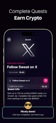 Bayar da dama a cikin Sweat Wallet ba ta tsaya ga tafiya kawai ba. Kana da ikon haɓaka dukiyarka ta hanyar kulle $SWEAT a cikin "Jars" don samun riba mai yawa, tare da zaɓuɓɓuka na musamman don masu son ci gaba. Kari a kan haka, zaka iya rage ko ma soke kuɗin mu'amalar crypto ta amfani da $SWEAT ɗinka ko kallon talla. Don ƙarin nishaɗi da samun kuɗi, "PlayHub" yana ba da ƙalubale masu ban sha'awa kamar Quests da Spin & Win, inda nasara ke nufin ƙarin crypto. Haka kuma, inganta iliminka game da crypto yana biya; kammala darussan ilimi kuma sami tukuici na crypto.